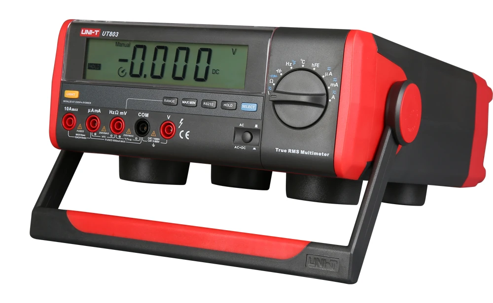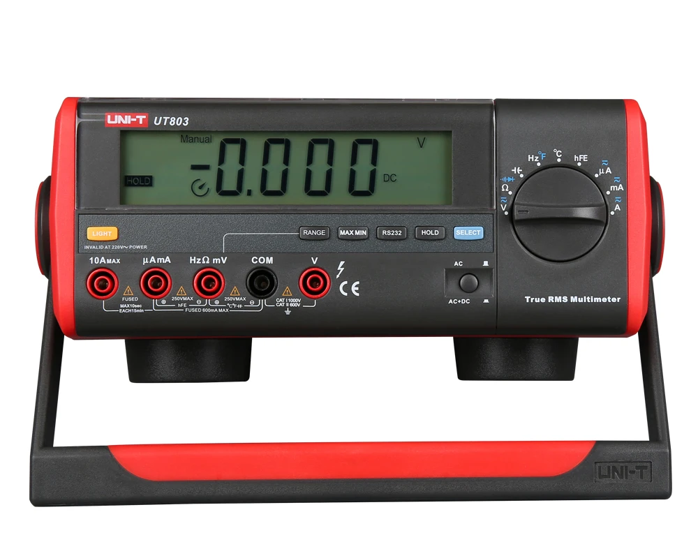 UT803-это автомобильный радиус действия 5999, trueRMS, цифровой мультиметр bench-type, оснащенный полнофункциональным дисплеем, полной защитой от перегрузки и уникальным внешним видом. Он используется для измерений от плавки, электроники, телекоммуникации, производства, нефти, национальной обороны, электрической энергии, химической промышленности, и это анексессорный экспериментальный инструмент для лабораторий в колледжах и университетах