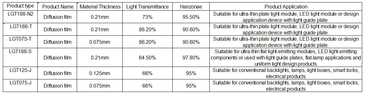 Диффузионная пленка (однородную пленку) используется для двухсторонний светильник коробки и задняя светильник продукты, светильник-направляющая пластина с отражающей пленкой и равномерной пленкой может двойной диффузионной пленкой brightnessThe в основном прикреплен к верхней части направляющей пластины-светильник для следующих функций: чтобы сделать светильник однородным, Направляющая Пластина для экрана или шариковая лампа для экрана;