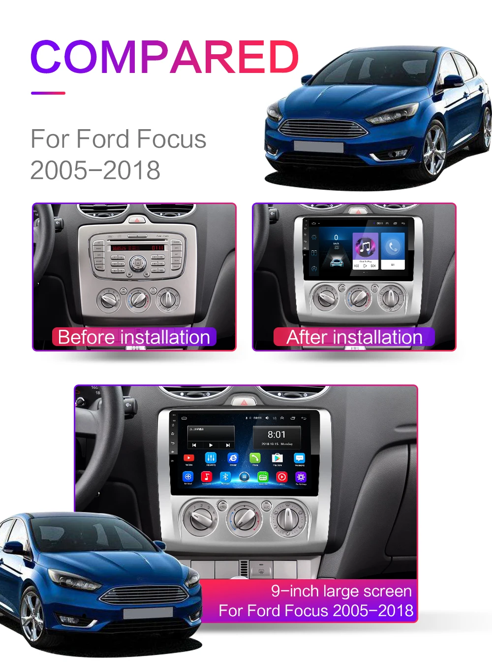 Для ford focus 2 3 Mk2/Mk3 2004 2005 2006 2007 2008 2009 2010 [руководство] 1, в комплектацию 4 ядра входит (RAM + ROM): 1G + 16G / 2G + 16G / 2G + 32G / 4G-SIM-3560-2G + 32G [дополнительно]; 2, 8-ядерная конфигурация включает (RAM + ROM): 7260L-2G + 32G / 7260L-4G + 64G / 4G-SIM-5760-2G + 32G / 4G-SIM-5760-4G + 64G / 4G-SIM-TS10-4G + 64G / 4G-SIM-TS10-6G + 128G [дополнительно]; 3, 4-ядерный содержат: версию: Android 8,1; Четырехъядерный процессор MTK8227 / Cortex-A7 Поддержка логотипа автомобиля 5; Пароль завода: 8888 Разрешение: HD 2.5D,1024*600; Не поддерживает функцию AM, RDS; Обыпосылка пакет версии WiFi поддерживает функцию вывода видео; 3560-4G-SIM-WiFi версия: Android 6,0; Поддерживает DSP; Не поддерживает функцию вывода видео; 4, 8-ядерный содержат: версию: Android 9,0 или Android 10; Восемь ядер: четырехъядерный процессор и четырехъядерный процессор GPU соответственно; Поддержка автомобиля logo5; Пароль Sfactory: 8888; Разрешение: HD 2.5D,1024*600; Версия 7260L-WIFI: поддерживает функции DSP, разделения экрана; Не поддерживает видеовыход; 4G-SIM-5760-WIFI и 4G-SIM-TS10-WIFI версия: поддерживает функции DSP, Carplay, разделения экрана; Не поддерживает видеовыход; 5, операционной системой Android можно установить приложение Google Play store Skype Facebook youTube Twitter и т. Д.; 6, поддержка: радиостанция, вызов Bluetooth, музыка Bluetooth, управление рулевым колесом, встроенный WiFi, MP3, видео музыка (MPG, AVI), навигация, видеовыход, зеркальная связь, USB 4G LTE WIFI донгл и другие функции; Поддержка OBD (опционально) Поддержка DAB + (опционально)
