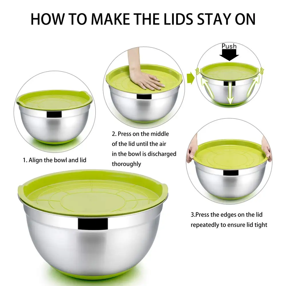 Пулевые точки: 1. Прочный Материал: изготовлен из высококачественной пищевой нержавеющей стали, крышка из пищевого полипропилена, не токсична и не имеет запаха, безопасна для использования. 2. Изысканная Полировка: Полированная зеркальная отделка сохранит блеск и долговечность, как и новая! 3. Идеальный дизайн: благодаря углубленной конструкции не беспокойтесь о брызгах во время игры в яйца и помешивании, изогнутое дно гладкое и нет мертвого угла при чистке. 4. Универсальное Использование: 7 разных размеров, более глубокий тип раковины очень подходит как миска для хранения, Фруктовница, чаша для попкорна, салатник, Сервировочная миска, миска для ингредиентов и чаша для печенья! 5. Идеальная Охота: идеально подходит для повседневного использования на семейном столе, эта многоцветная чаша из нержавеющей стали добавляет блеска вашей кухне. Размер: Диаметр-18 см; Глубина-9,5 см Диаметр-20 см; Глубина-9,8 см Диаметр-22 см; Глубина-10,5 см Диаметр-24 см; Глубина-11,2 см Диаметр-26 см; Глубина-12 см Диаметр-28 см; Глубина-13,3 см Диаметр-30 см; Глубина-14 см Использование: подходит как миска для хранения, Фруктовница, чаша для попкорна, салатник, Сервировочная миска, миска для ингредиентов и чаша для бисквита! Преимущества ☑Глубокий край-глубокая и большая чаша помогает содержать больше пищи и уменьшить брызги при смешивании ☑Нескользящее дно-Силиконовое основание удерживает чашу устойчиво сидеть при смешивании, взбивании и взбивании ☑7 цветов-каждый цвет представляет один размер, цвет крышки соответствует дну для удобства сопоставления и поиска ☑Герметичная крышка-пластиковая крышка обеспечивает надежное уплотнение чаши, идеально подходит для герметичного хранения ☑Долговечность-наша чаша имеет прочную конструкцию, они небьются и устойчивы к ржавчине в течение многих лет долговечности ☑Легкая очистка-зеркальная поверхность внутри позволяет чашам легко высвобождать пищу и чистить Посылка 1 или 5 чаша с крышкой Инструкции по использованию 1. Перед первым использованием Вымойте Набор чаш теплой мыльной водой, чтобы смыть остатки, оставшиеся в процессе изготовления. 2. Пожалуйста, очистите и высушите чаши после использования для их долговечности и вашего здоровья. 3. Пожалуйста, не ставьте миски в духовку для долговечности силиконового дна. Обратите внимание: Миски для смешивания пригодны для мытья в посудомоечной машине, крышки рекомендуется мыть вручную для сохранения прочного уплотнения крышки к миске