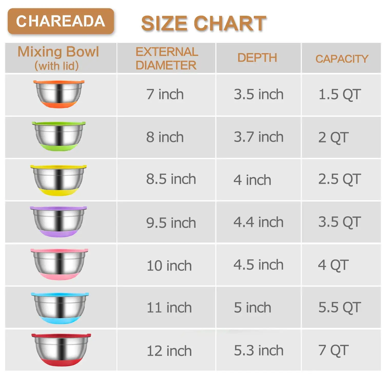 Характеристики продукта 1. Высококачественный материал из нержавеющей стали, без ржавчины и запаха химических веществ. 3. Нескользящее Силиконовое дно, убедитесь, что миски остаются на месте во время смешивания. 4. Без BPA герметичная крышка, чтобы держать еду чистой и свежей. 5. Посудомоечная машина, холодильник и морозильная камера. 6. Четкая Точная метка для измерения объема на внешней стороне 7. Дизайн с цветным кодом, чтобы добавить больше удовольствия во время приготовления пищи 8. Дуговое дно без мертвых углов при очистке. Размер: Диаметр-18 см; Глубина-9,5 см (1,5 QT: 3,5x7 дюймов) Диаметр-20 см; Глубина-9,8 см (2 QT: 3,7x8 дюймов) Диаметр-22 см; Глубина-10,5 см (2,5 QT: 4x8,5 дюймов) Диаметр-24 см; Глубина-11,2 см (3,5 QT: 4,4x9,5 дюймов) Диаметр-26 см; Глубина-12 см (4 QT: 4,5x10 дюймов) Диаметр-28 см; Глубина-13,3 см (5,5 QT: 5x11 дюймов) Диаметр-30 см; Глубина-14 см (7 QT: 5,3x12 дюймов) Применение: подходит как миска для хранения, миска для фруктов, чаша для попкорна, Салатница, миска для сервировки, миска для ингредиентов и миска для печенья! Преимущества ☑Глубокий край-глубокая и большая чаша помогает содержать больше пищи и уменьшать разбрызгивание при смешивании ☑Нескользящее дно-силиконовая основа держит чашу стабильно сидеть при смешивании, взбивании и ударе ☑7 цветов-каждый цвет представляет один размер, цвет крышки соответствует нижней части для удобного подбора и поиска ☑Герметичная крышка-пластиковая крышка остается сильным уплотнением для чаши, идеально подходит для герметичного хранения ☑Прочный-наша чаша имеет прочную конструкцию, они Небьющиеся и устойчивы к ржавчине в течение многих лет долговечности ☑Легкая очистка-Внутренняя зеркальная поверхность делает миски легко высвобождающими еду и чистыми Посылка включает в себя: 1 или 5 чаш с крышкой Инструкция по использованию 1. Перед первым использованием постирайте миску теплой мыльной водой, чтобы удалить остатки, оставленные в процессе производства. 2. Пожалуйста, очистите и высушите миски после использования для их долговечности и здоровья. 3. Пожалуйста, не кладите миски в духовку для долговечности силиконового дна. Пожалуйста, обратите внимание: Миски для смешивания безопасны в посудомоечной машине, крышки рекомендуется ручная стирка для сохранения сильного уплотнения крышки в чаше