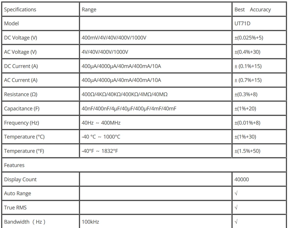 Серия UT71 отличается высокой точностью, высоким разрешением и истинным мультиметром RMS. Он может обеспечить измерение верхнего/нижнего предела и сигнал тревоги о превышении диапазона. Благодаря своей эффективной рабочей способности и функции подключения Bluetooth, безопаснее контролировать, записывать и устранять неисправности. Это идеальный инструмент для контроля партии и проверки электрических частей или продуктов и сложных устранения неполадок в передовом производстве.