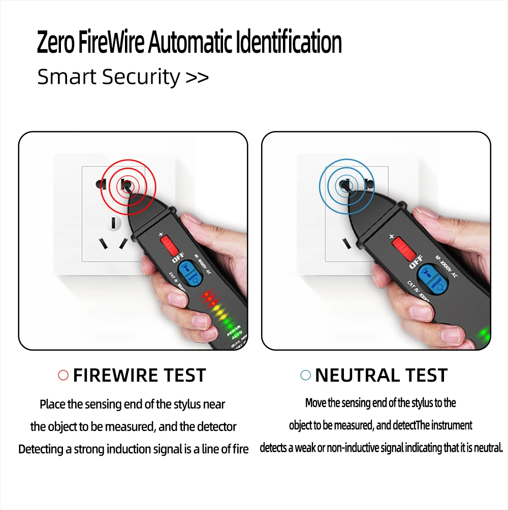 Neutral Wire/Live Wire Check: intelligently identifies zero-fire lines with the inductive head, the strong induced signal is live wire, the weak or non-sensing signal is neutral wire.
