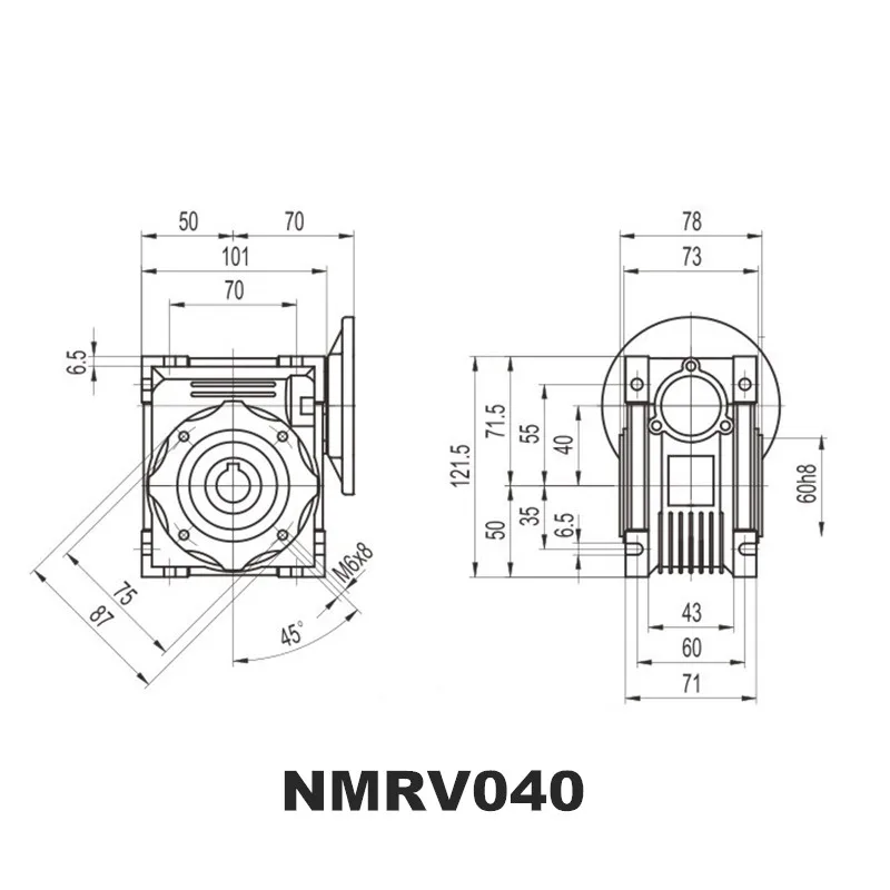 Модель:NMRV040 Тип: червячный редуктор Скорость размерное соотношение: 5:1, 7,5: 1, 10:1, 15:1, 20:1, 25:1, 30 :1, 40:1, 50:1,60:1,80: 1100: 1(Пожалуйста, напишите соотношение, которое вам нужно после заказа) Вход диаметр Размеры: 11-14 мм (Установка по умолчанию = 14 мм) Модель входного фланца: NEMA34 86 мм(Для другой модели фланца, пожалуйста, оставьте сообщение) Диаметр выходного вала: 18 мм Применение: сочетается с сервоприводом/шаговым двигателем Товары Цвет: Argentate Фланцевая рама (A * A):60*60,86*86,90*90,104*104