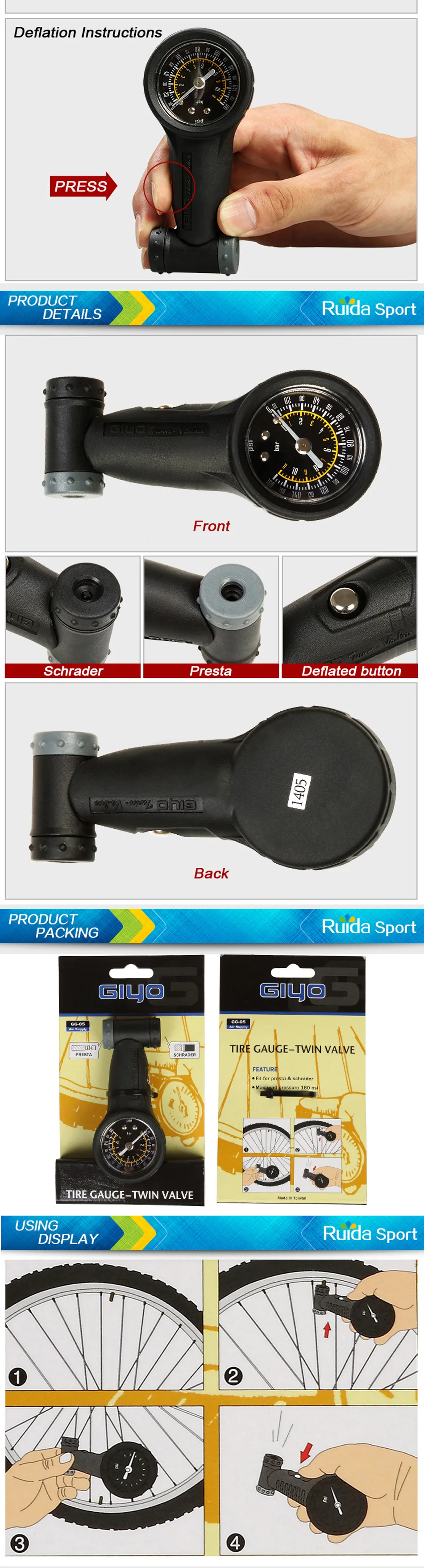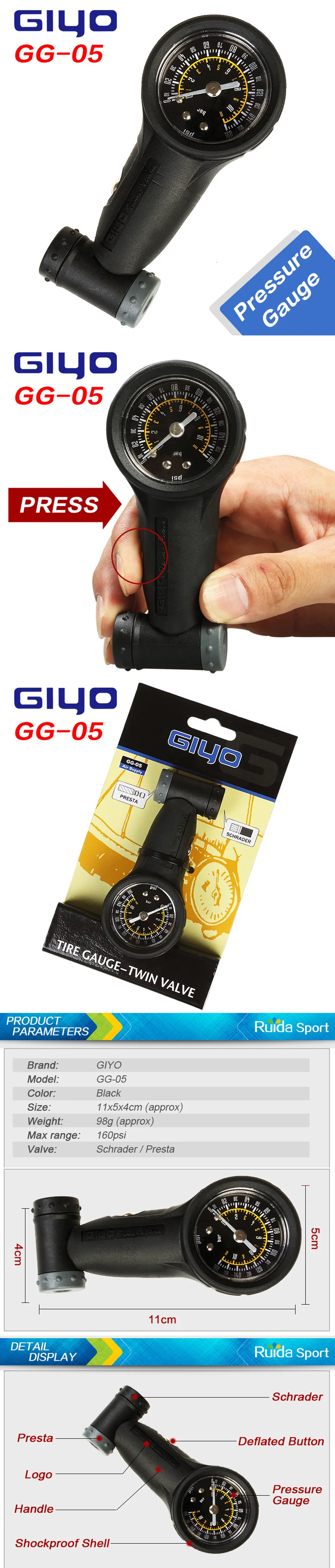 Бренд: GIYO Модель: GG-05 Цвет: черный Размер: 11x5x4 см (прибл.) Вес: 98 г (прибл.) Макс. Гуаж: 160psi Клапан: Schrader / Presta