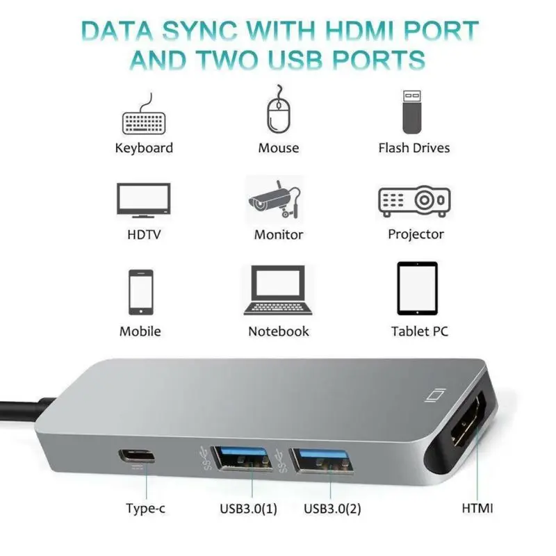 Feature: 1.USB-C to HDMI 4 in 1 Hub---This hub contains one Type-C and two USB3.0 ports, connected with an output Type-C port, providing high data transfer speed up to 5 Gbp/s(10x faster than USB 2.0), and it is fast enough to transfer images, files, and videos in seconds. 2.VIVID 4K VIDEO OUTPUT---It could mirror or extend your screen with USB-C hub port for HDMI and directly stream 4K UHD, 30Hz or full HD 1080P video to HDTV, monitor or projector. It will bring you a vivid 3D effect video sync. 3.EASY TO USE---It is pluy and play with no external drivers or power required. And it allows you to connect with portable devices such as wired keyboard, USB flash drive, 2.5mm external disk, etc.(Due to the power supply limit of the laptop, some high-power devices may not boot up, like 3.5mm external disk, printer, etc.). It is not for SuperDrive 4.Widely Compatible---For MacBook Pro 2016 2017 2018, for New MacBook Air 2018 - (Not for previous-generation MacBook Air and Pro), for MacBook 12, for New iMac/Pro, for Surface Book 2/Go, for Chromebook, for Pixelbook, for Dell, for HP, for Huawei mate 20/P20, for Samsung S8/S8 Plus/S9/ S9 Plus /S10, and more fully-functional Type C devices. 5.MAC-STYLE DESIGN---It has the unibody aluminum alloy exterior, ionized finish, and reinforced TPE cable coating. It comes with the EMI protection to prevent interfere with wireless devices and has the lightweight and appropriate size to carry in your laptop bag when traveling Specification: Type:USB Adapter Connector(s):USB-C,For HDMI Theme:Houses Packaged:Bag Packaged include: 1 x adapter Note: Due to the screen difference, the color might be a little different from what you expect, please allow it