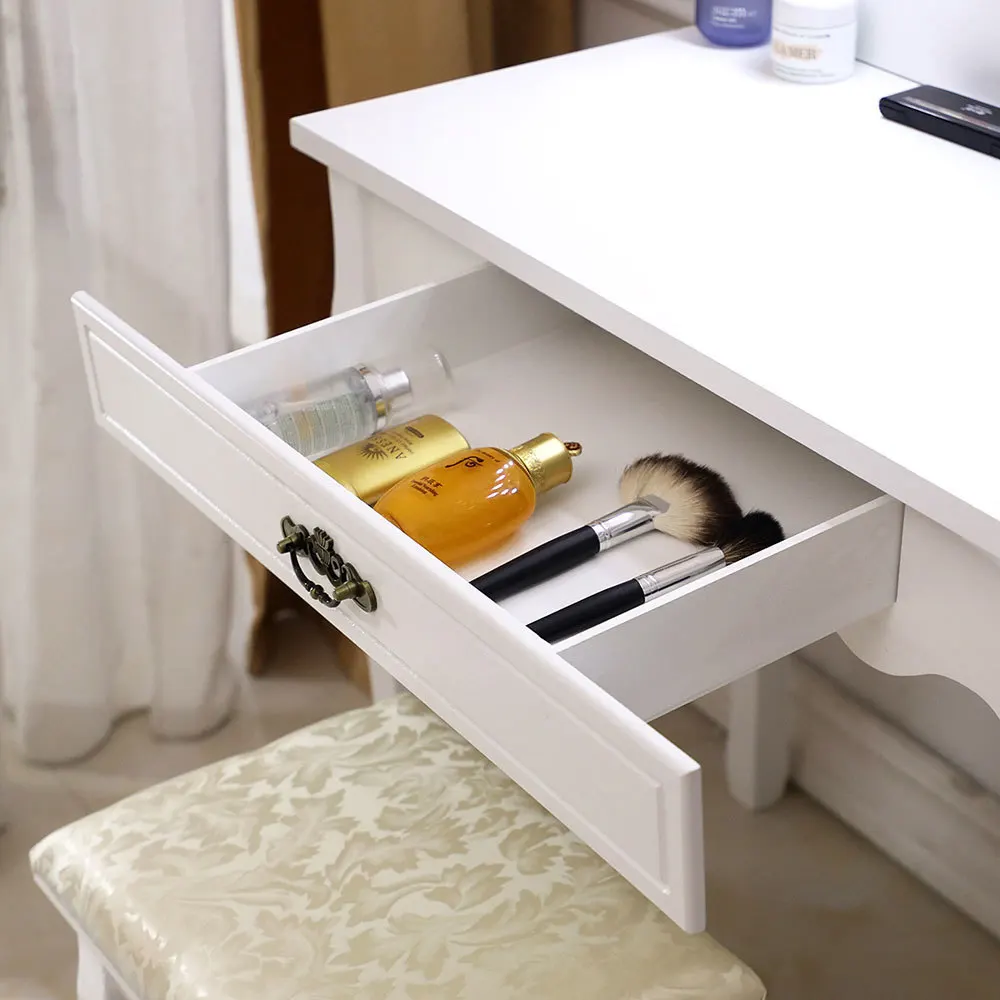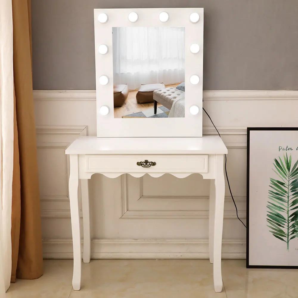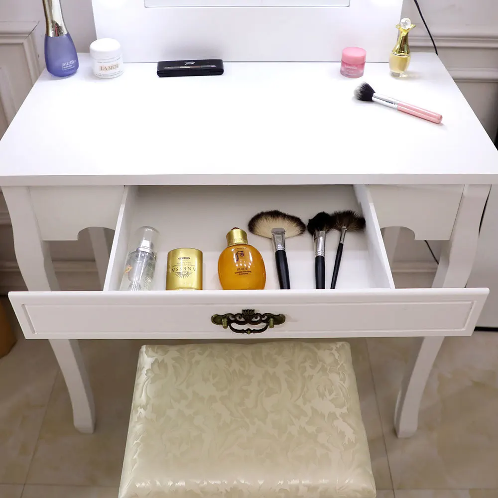 Это туалетный столик с большим косметическим зеркалом. Это высокое качество P2 MDF лист в сочетании с твердой деревянной ножкой и специальной металлической ручкой. Он имеет большой ящик для различных косметических средств. Он имеет большое косметическое зеркало на столе и 10 больших ламп на зеркале, чтобы обеспечить большой опыт освещения для вашего ночного макияжа. И кнопка переключения на боковой стороне зеркала проста и удобна.