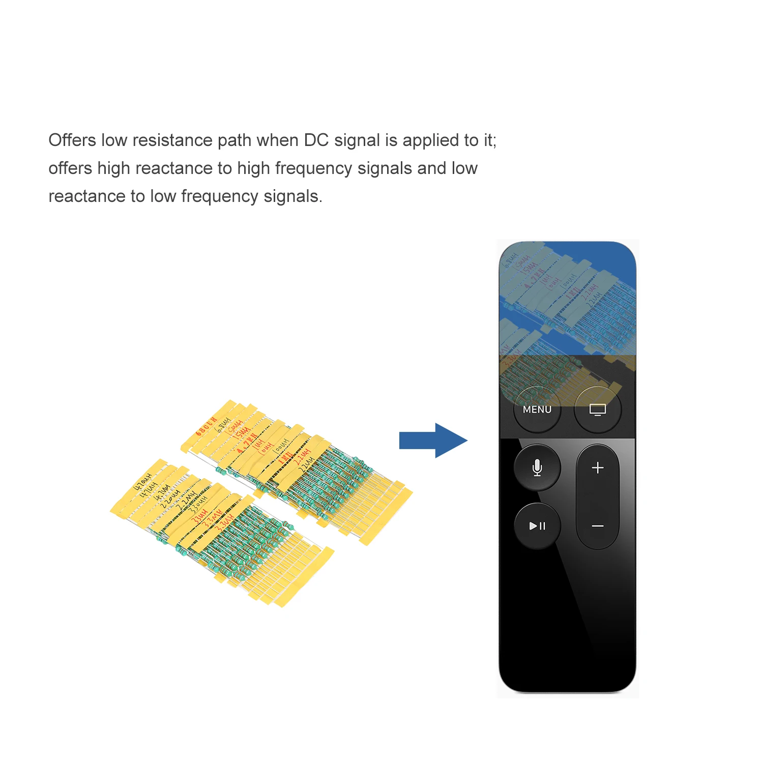 Включает 20 различных значений индуктивности (10 шт. каждого типа): 1 μH/10 μH/100 μH/1MH; 2,2 μH/22 μH/220 μH/2.2MH; 3,3 μH/33 μH/330 μH/3.3MH; 4,7 μH/47 μH/470 μH/4.7MH; 6,8 μH/680μH; 15 μH/150μH.