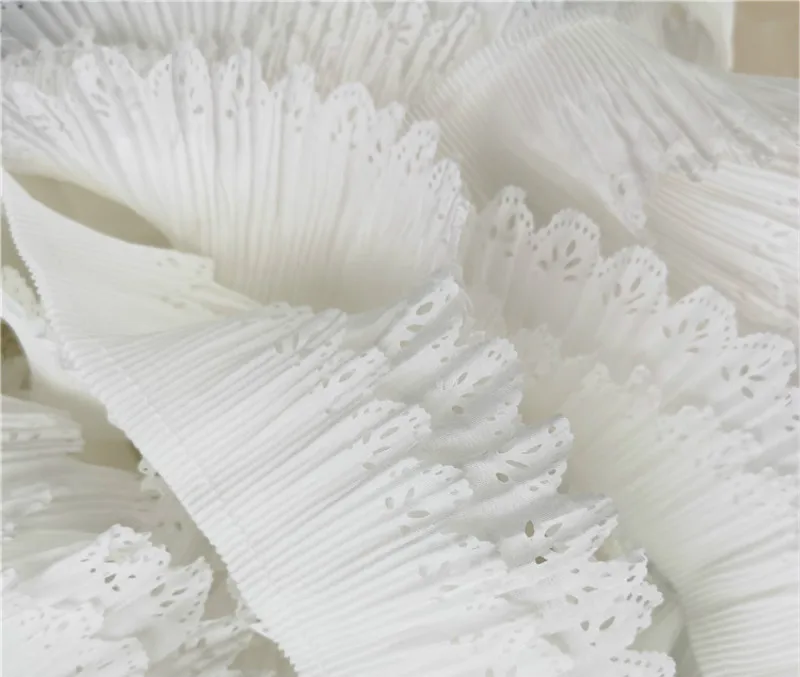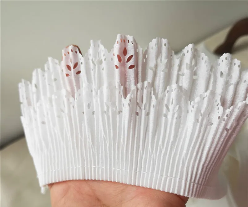 Very, very nice lace pleated double row of 8 cm. White. Bought for my dolls 40 cm: fits perfectly. Be careful immediately to Oversew the stitch of the thread of the pleat after cutting it so that the pleat does not disappear. I recommend it. Arrived quickly in France.