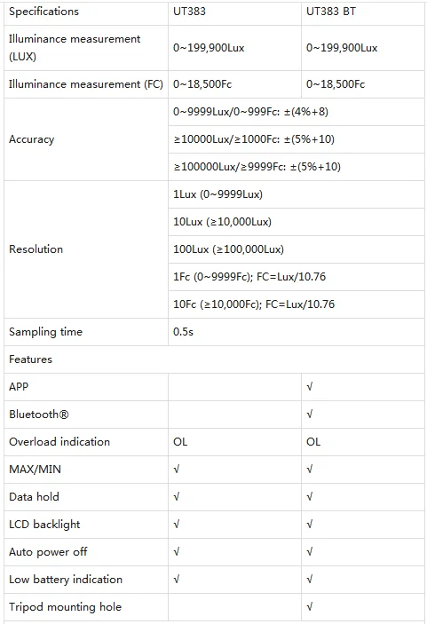 UT383 BT может эффективно отображать интенсивность света электрическими сигналами, затем обрабатывать данные и отображать результаты измерений на ЖК-дисплее. Функция Bluetooth добавлена для передачи и анализа данных в мобильном приложении ienv. Его можно загрузить из Google Play или Apple Store. 1 светильник вес, удобный интерфейс 2. Технология контроля стабильности напряжения, низкое энергопотребление 3. Калибровка источника светильник для повышения точности и согласованности Обратите внимание: батарея в комплект не входит