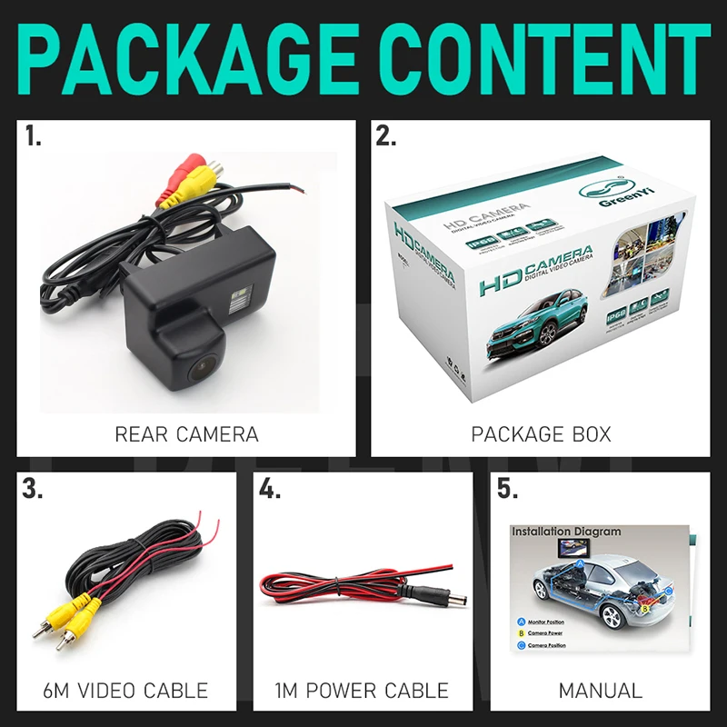 * Камера заднего вида x 1 * 6 м RCA видео кабель x 1 * Кабель питания x 1 * Посылка x 1 * Инструкции x 1
