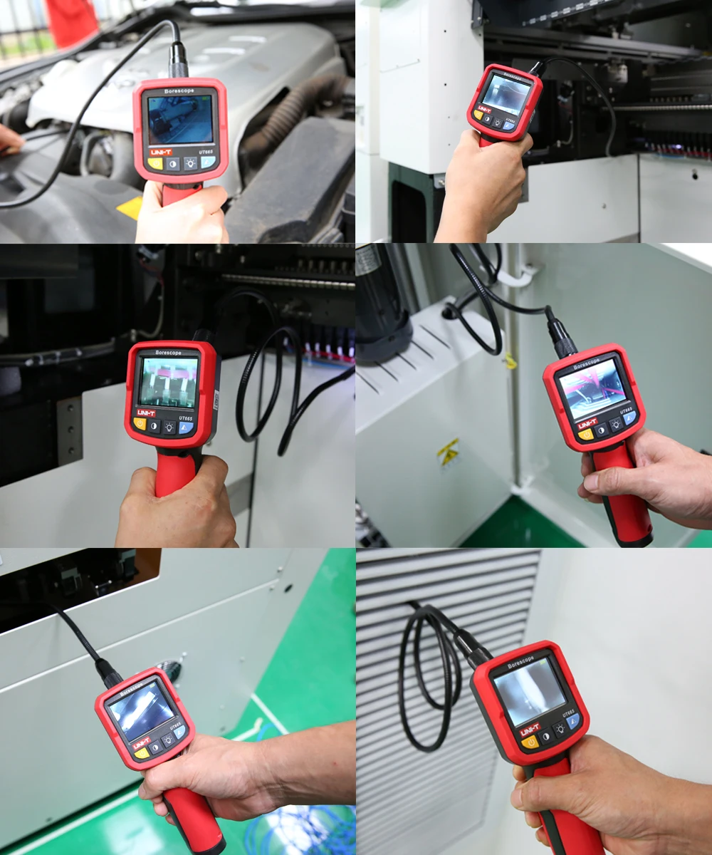 UT665 borescope отображает четкие изображения через гибкий зонд камеры. Это полезно для просмотра деталей автомобильного двигателя, трубопроводов, внутренних строительных стен, сливных труб и других труднодоступных мест. Он разработан с 4 уровня регулировки скорости светодиодный свет и 180 градусов угол обзора IP67 зонд, который может быть погружен в воду.