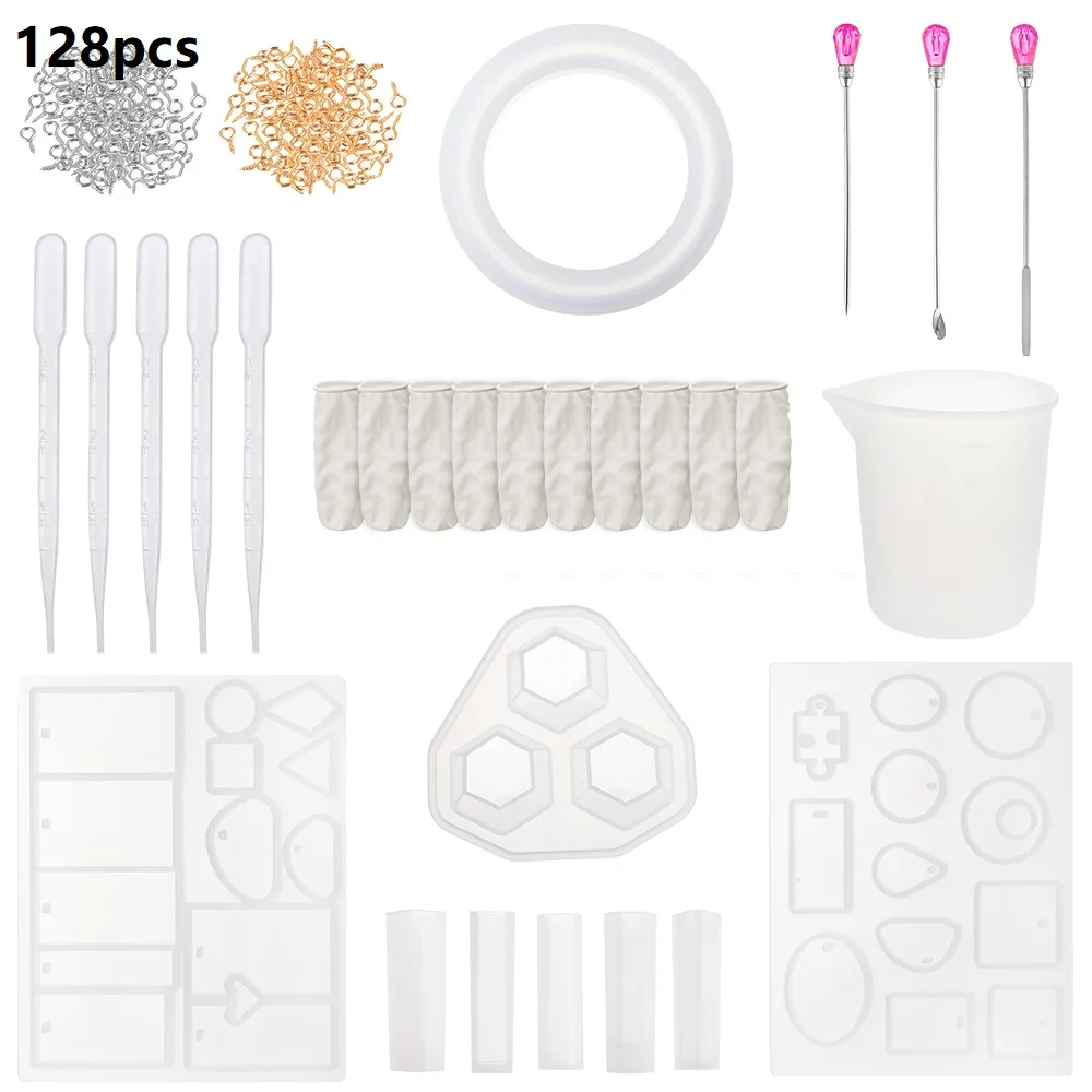 В комплект входит: 9 силиконовых форм, 3 металлических стержня для перемешивания, 5 пластиковых капель, 1 мерный стаканчик, 10 пальчиковых колец, 100 винтовых штифтов для глаз.