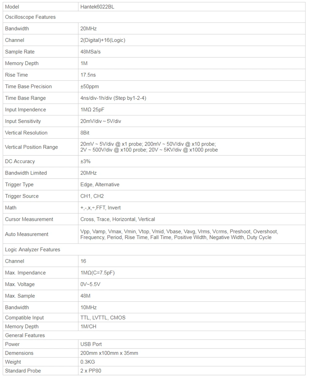 1 * 6022BL осциллограф 2 * Датчик осциллографа 1 * USB кабель 1 * набор зажимов Перемычки (цвет случайный) 2 * Соединительный кабель 1 * CD (руководство и т. д.)