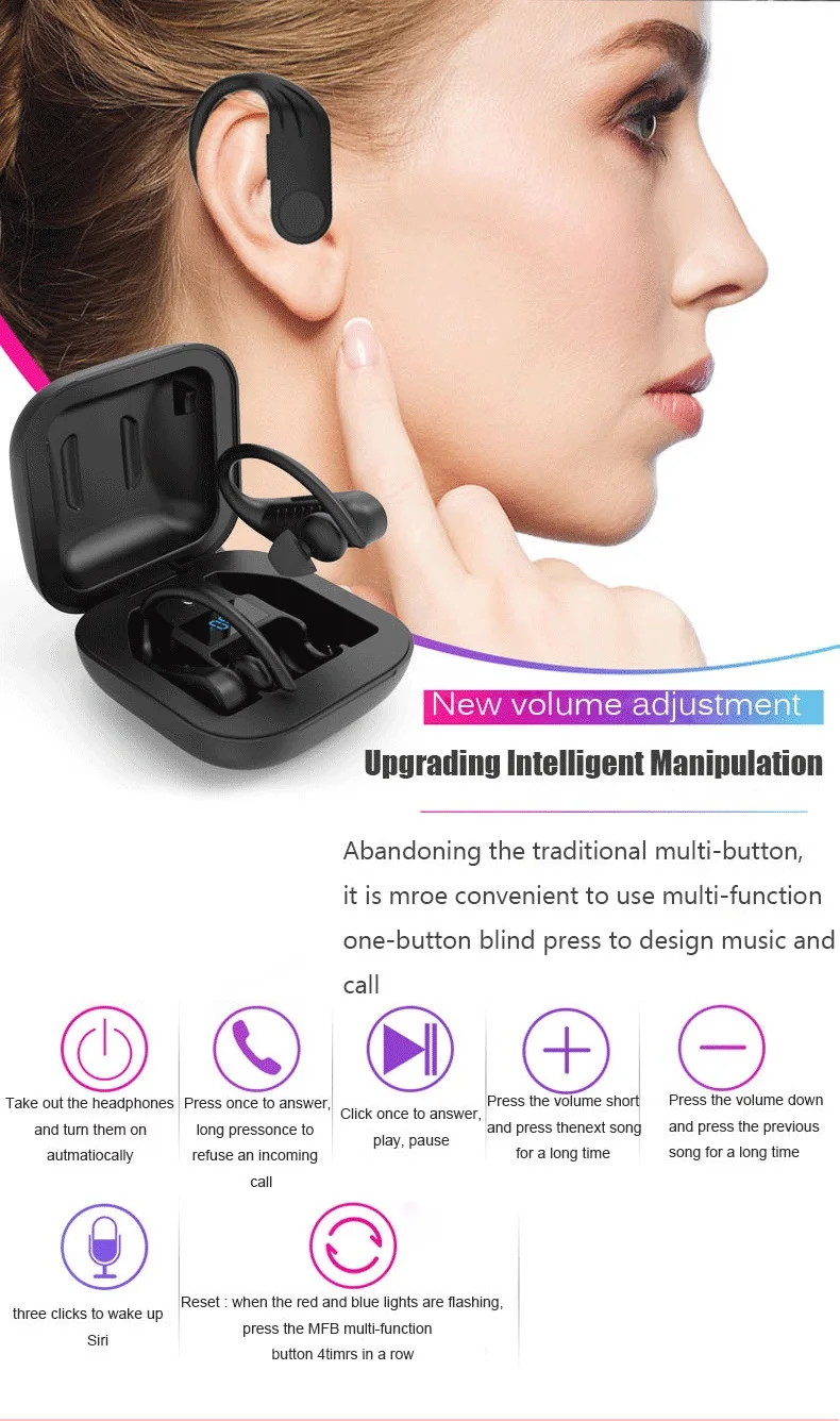 8D объемный звук, 5,0 в обоих ушах чип, большая емкость, беспроводная гарнитура Bluetooth. Графеновая басовая диафрагма, Hi-Fi высокочастотная технология, 10 мм динамический динамик. Два способа подключения: один/двойной свободный в использовании, одиночное ухо, прослушивание в одиночестве, прослушивание Hi-Fi стерео в обоих ушах. Binaural HD вызов, 5,0 Автоматическое Сопряжение загрузки, Встроенный активный шумоподавление IC. Функция: бинауральный hd-вызов, воспроизведение паузы, ответ на вызов, Отклонение вызова, воспроизведение конечного номера, вызов Siri, переключение песни вверх и вниз, Автоматическое Сопряжение, интеллектуальное шумоподавление, никаких задержек в игре.