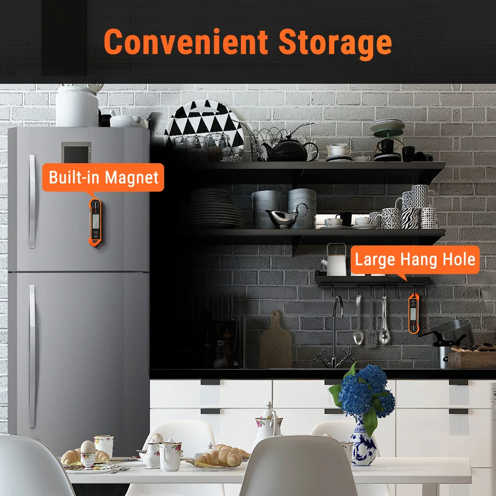 Сильный магнит внутри задней части складного термометра, что позволяет намагничивать устройство к двери холодильника, стойке для барбекю; Используйте большое отверстие для подвешивания, чтобы разместить на кухонном крючке.
