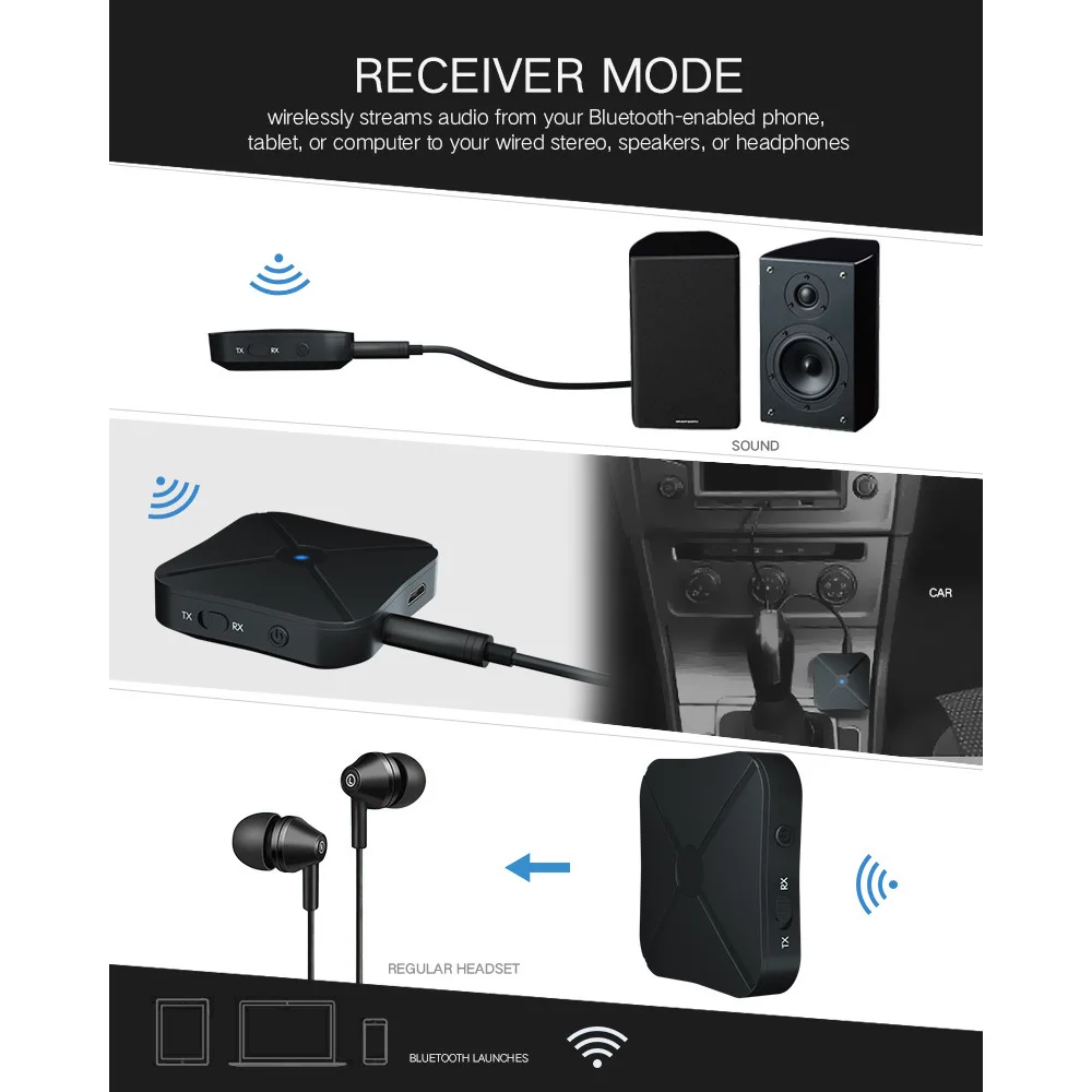 * Режим передатчика: Беспроводная передача аудио с вашего телевизора без Bluetooth, домашней стереосистемы или CD-плеера на наушники или колонки Bluetooth