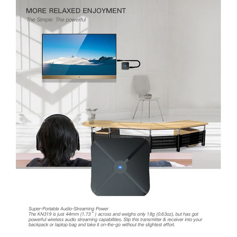 KN319 всего 44 мм (1,73 дюйма) и весит всего 18 г (0,63 унций), но имеет мощные возможности беспроводной потоковой передачи аудио. Вставьте этот передатчик и приемник в рюкзак или сумку для ноутбука и возьмите его на ходу без каких-либо усилий.