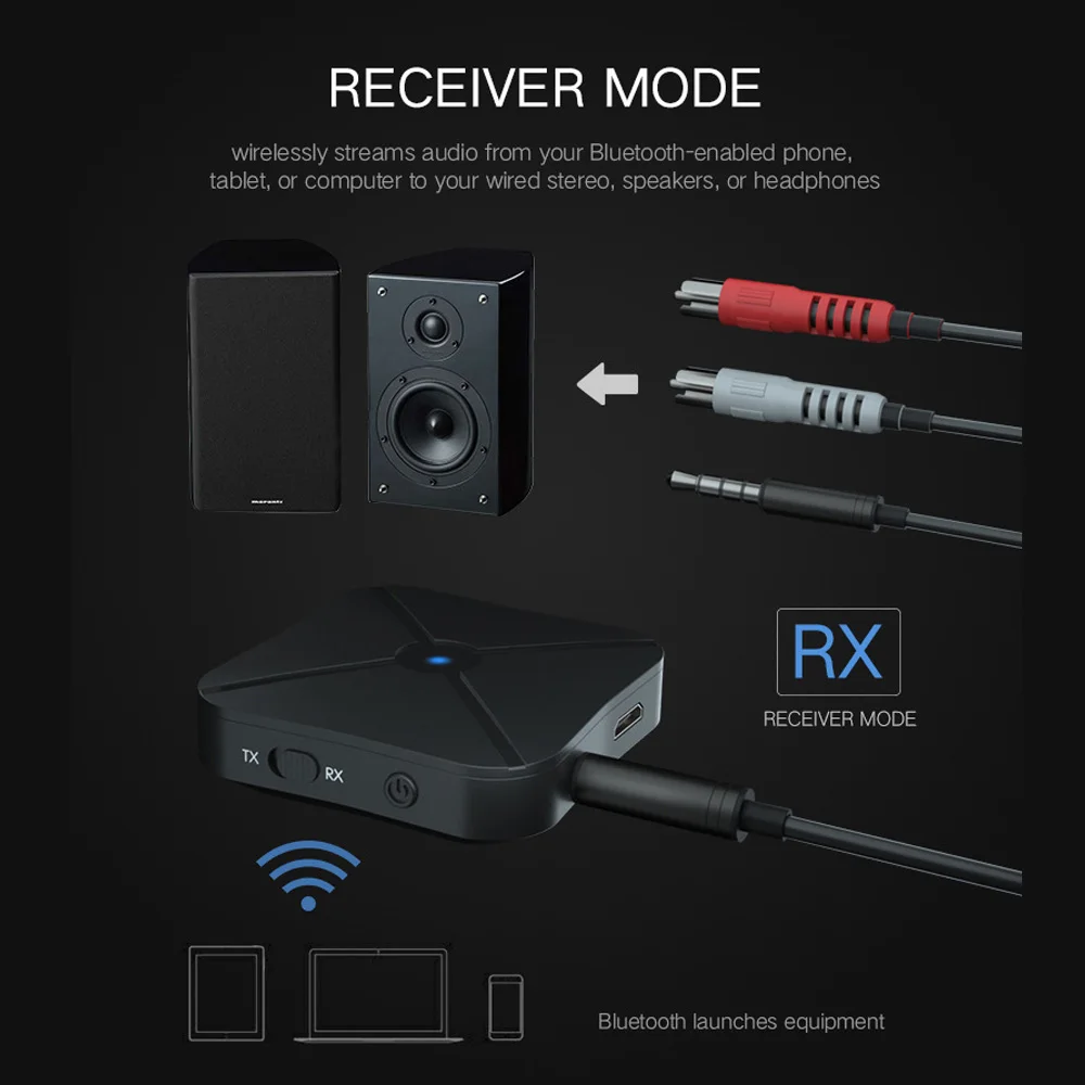* Переключение между режимами передатчика и приемника с простым щелчком переключателя. Легко Подключайтесь с помощью передовой технологии Bluetooth и аудиокабеля 3,5 мм (в комплекте).