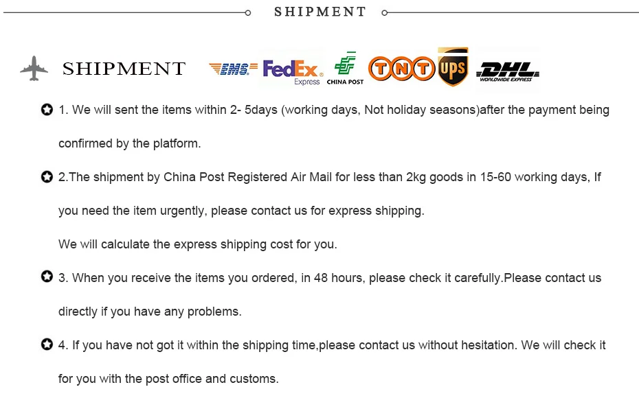 3. Доставка через границу и Авиапочта-это самый дешевый способ доставки, поэтому Доставка занимает много времени. Если вы не хотите ждать так долго, пожалуйста, оплатите Экспресс-плату или не покупайте его.