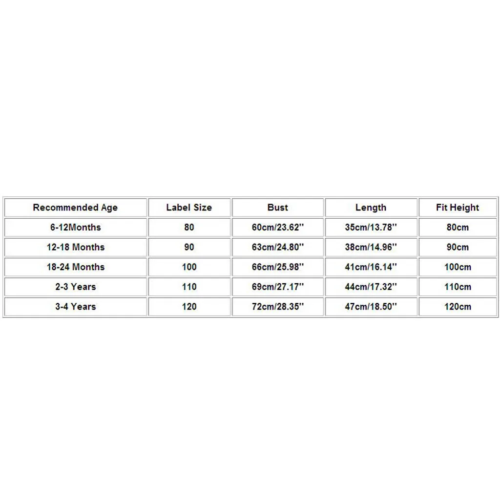 Рекомендуемый возраст Размер этикетки Бюст Длина Подходящая высота От 6 до 12 месяцев 80 60 см/23,62'' 35 см/13,78'' 80 см 12-18 месяцев 90 63 см/24,80'' 38 см/14,96'' 90 см 18-24 месяцев 100 66 см/25,98'' 41 см/16,14'' 100 см От 2 до 3 лет 110 69 см/27,17'' 44 см/17,32'' 110 см От 3 до 4 лет 120 72 см/28,35'' 47 см/18,50'' 120 см