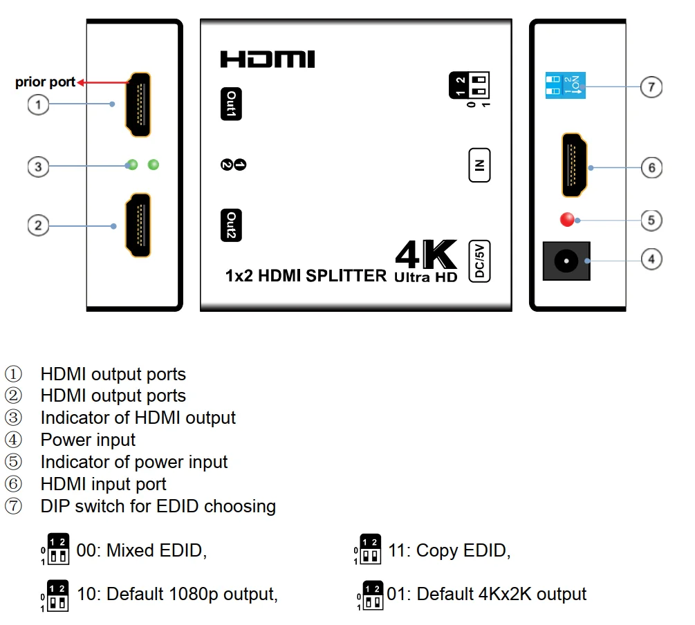 1) одновременно отображает источник UItra Hi-Def на двух hd-дисплеях UItra. 2) поддерживает разрешение до UItra HD 4K x 2K(3840x2160 @ 60Hz YUV 4:2:0) и 1080p Full HD. 3) поддерживает четыре вида возможностей обработки EDID: смешанный EDID, копия EDID, выход по умолчанию 1080p, выход по умолчанию 4K x 2K. 4) поддерживает 36 бит глубокого цвета. 5) поддерживает LPCM 7,1, Dolby TrueHD, Dolby digital Plus и DTS-HD Master Audio 6) Поддержка входного/выходного кабеля HDMI от 10 до 15 метров с разрешением 1080p/8 бит. 7) Совместимость с HDCP. 8) Поддержка 3D.