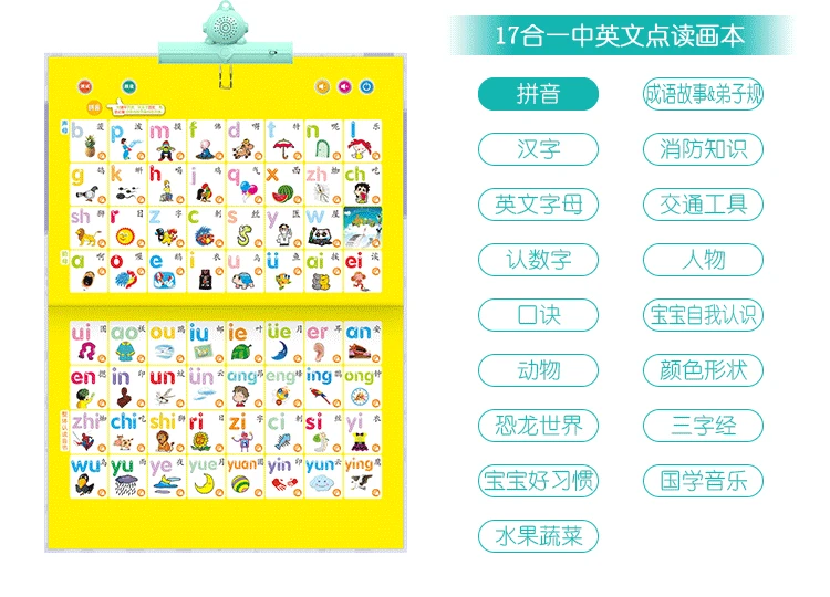 Включение питания: нажмите кнопку «открыть ключ» для включения Переключение обучающего содержимого: нажмите кнопку «переключатель», чтобы начать изучение текущей страницы. После поворота страницы необходимо нажать кнопку «переключатель», чтобы перейти к текущей странице для обучения Начало обучения: нажмите на маленький рог на следующей странице, чтобы начать изучение соответствующего содержимого. Выключение питания: после завершения исследования нажмите кнопку «открыть ключ» для выключения питания. Другой тест функционального ключа: система проверяет содержимое текущей страницы, переключатель на китайском и английском языках: переключатель на китайском и английском языках нажмите и прочитайте голос и чтение: система считывает содержание обучения в порядке, ребенок может читать вместе. Содержимое внутренней страницы: pinyin, китайские иероглифы, английские буквы, распознавание чисел, формула, животные, водные овощи · Овощи, транспортные средства, фигурки, Детские самопознания, цвет и форма, три символа классики, развитие китайской музыки Размер: 39*60 см