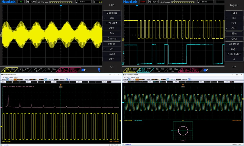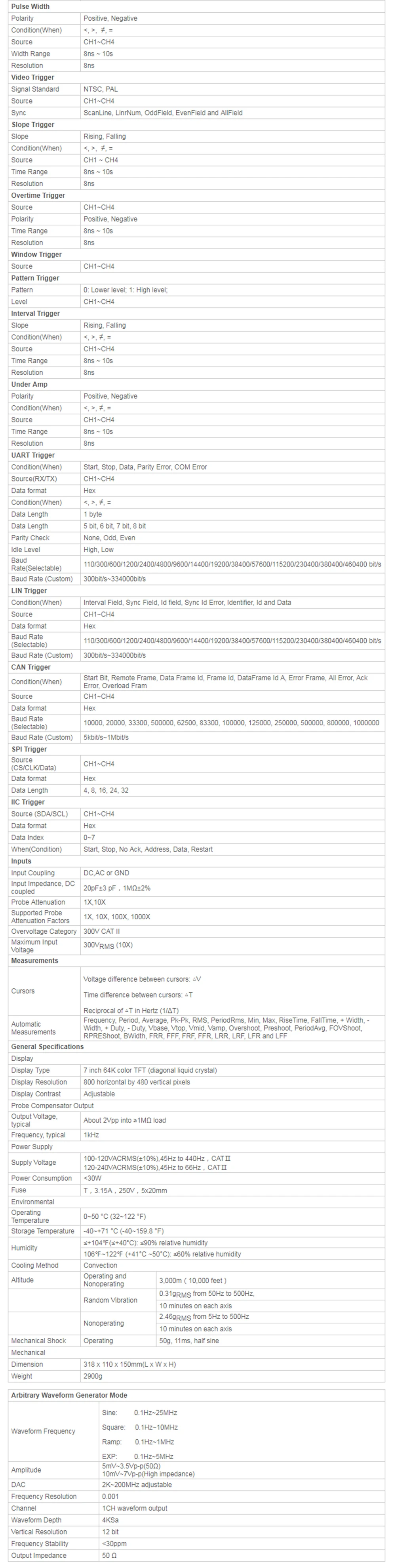 4-канальный осциллограф, с 1-канальным Arbitary/функциональным генератором сигналов, независимыми клавишами осциллографа и генератором сигналов, который прост в эксплуатации одновременно .. Полоса пропускания 80-250 МГц, минимальный диапазон измерений 500μв/дел, частота дискретизации 1GS/s, усовершенствованная цифровая ТРИГГЕРНАЯ система, высокая чувствительность триггера, низкий триггерный дрожание, высокое разрешение 7 дюймов 64K цветной TFT (800*480)