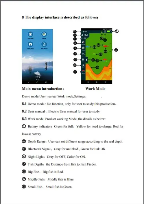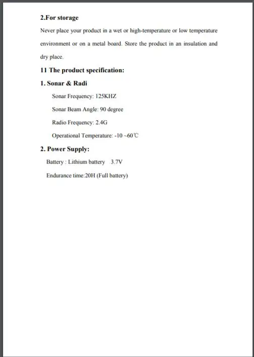 Сонар угол излучения: 105 градуса: материал подошвы: полиуретан толщина 0,6-48M(2.5-120FT) Диапазон Bluetooth: 20 м гидролокатор частота: 125 кГц Мощность жизнь прочного: 15 часов