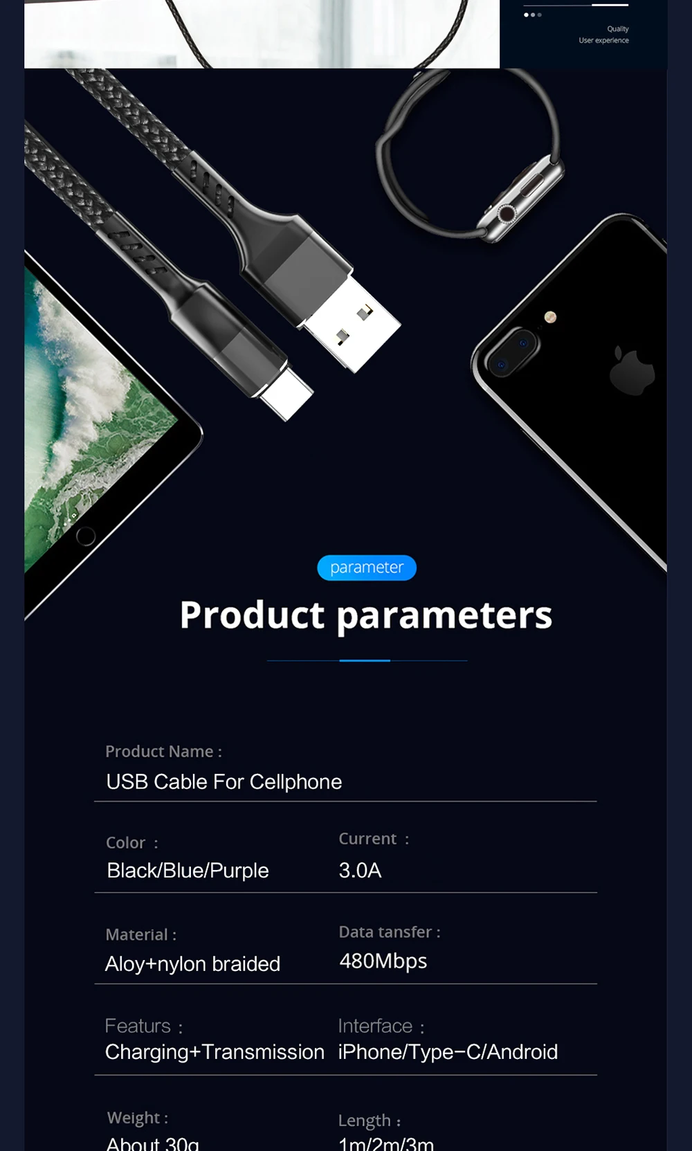 Название продукта: новый круглый плетеный кабель для передачи данных Интерфейс продукта: Lihtning 8PIN, Micro USB, TYPE-C (три основных интерфейса являются дополнительными) Цвет изделия: синий, черный, красный, фиолетовый Длина изделия: 1 м/2 м/3 м Характеристики медного провода: зарядка (43*2) + данные (16*2) * 0,08 мм (3A) Преимущества продукта: экологически чистый провод, TPE внутреннее одеяло, провод мягкий, прочный, не легко завязывать, чувствовать себя хорошо, высокого качества и текстуры, чтобы решить ваши проблемы с несколькими линиями при выходе.