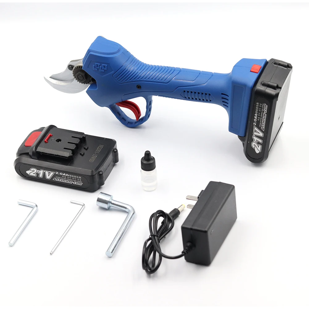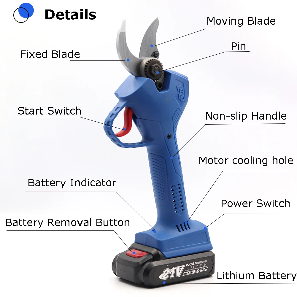 -Резак для веток: Мощность: 185 Вт Напряжение: 21 в Номинальный ток: 10A Защита от перегрузки по току: менее 45A Макс резки: 30 мм Основные материалы: ПВХ, металл -Батарея: Время работы: approx.6-8 часов Батарея: литиевая, 2 * 2.0Ah батарея Напряжение: 21 в -Зарядное устройство: Напряжение зарядки: 110-240 В переменного тока, 50-60 Гц Выходное напряжение: 21 в • Сила тока: 1A Время зарядки: approx.2hs