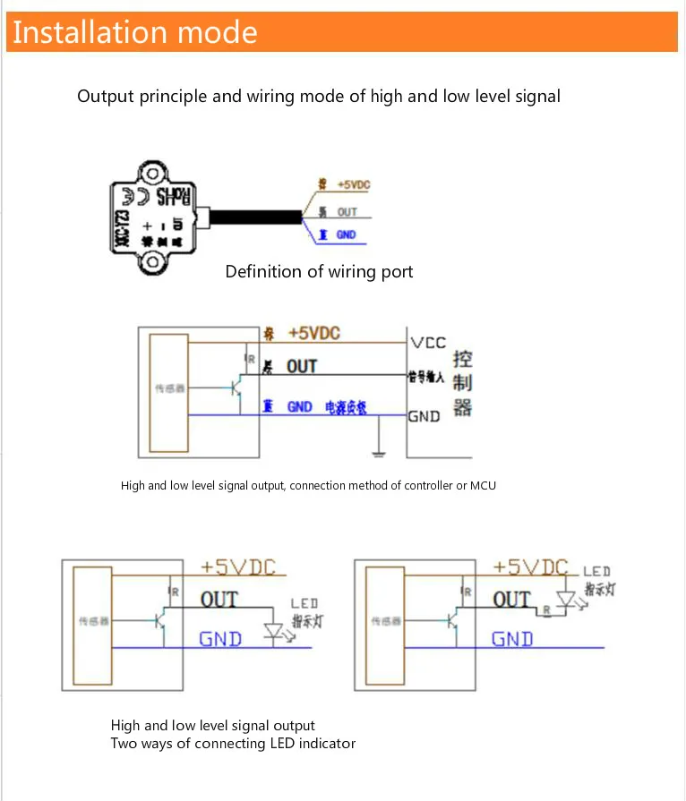 Product parameters Name: small non-contact liquid level sensor Model: liquid level sensor Material: polymer Color: elegant white Working voltage: 5V Output model category: switch sensor Sensor category: liquid level sensor Applicable scenario: liquid level detection Installation mode Screw fixed installation Fixed support for text face Fixed bracket sensor M2.5 countersunk head screw Wordless sensing surface close to water tank 1. Install the sensor on the bracket 2. Tighten the screws 3. Water tank close to sensor Paste installation method The paste installation method is shown in the figure above, which can be directly pasted on the outer wall of the plastic container. Paste materials can be glass glue, 704 silica gel, waterproof 3M double-sided adhesive, etc matters needing attention: 1. can not use foam cotton material to upgrade double-sided adhesive. 2. The container material must be insulation material 3. try to use the material with uniform material without air interlayer, without bubble, without water absorption, and not easy to change the dielectric constant as the container. Installation mode Output principle and wiring mode of high and low level signal Definition of wiring port High and low level signal output, connection method of controller or MCU High and low level signal output Two ways of connecting LED indicator 1. Wire length is 290mm 2. The terminal wiring sequence is as follows: (1) Brown wire: power positive (2) Black line: signal output (3) Blue wire: negative pole of power supply 3. Terminal specification and model: xh254-3p