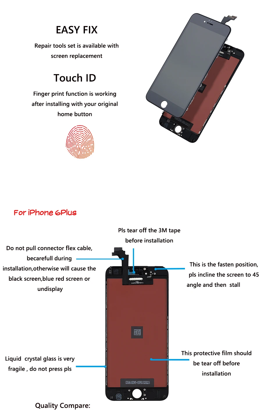 1. Outer glass + touch digitizer + lcd screen + middle frame , assembly, Replacement digitizer and touch screen lcd assembly for iPhone . 2. Replacing & Repair your old, broken, cracked, Wrong color issues lcd display 3. Factory supply directly, large quantity are in stock 4. Each lcd screen has been tested 3 times to ensure zero defect, No spot, No dead pixel and No any function issues before shipping, 100% brand new 5. Packed very well and safe, Bubble bag+ foam box 6. Delivery your order within 1-2 working days after payment confirmed