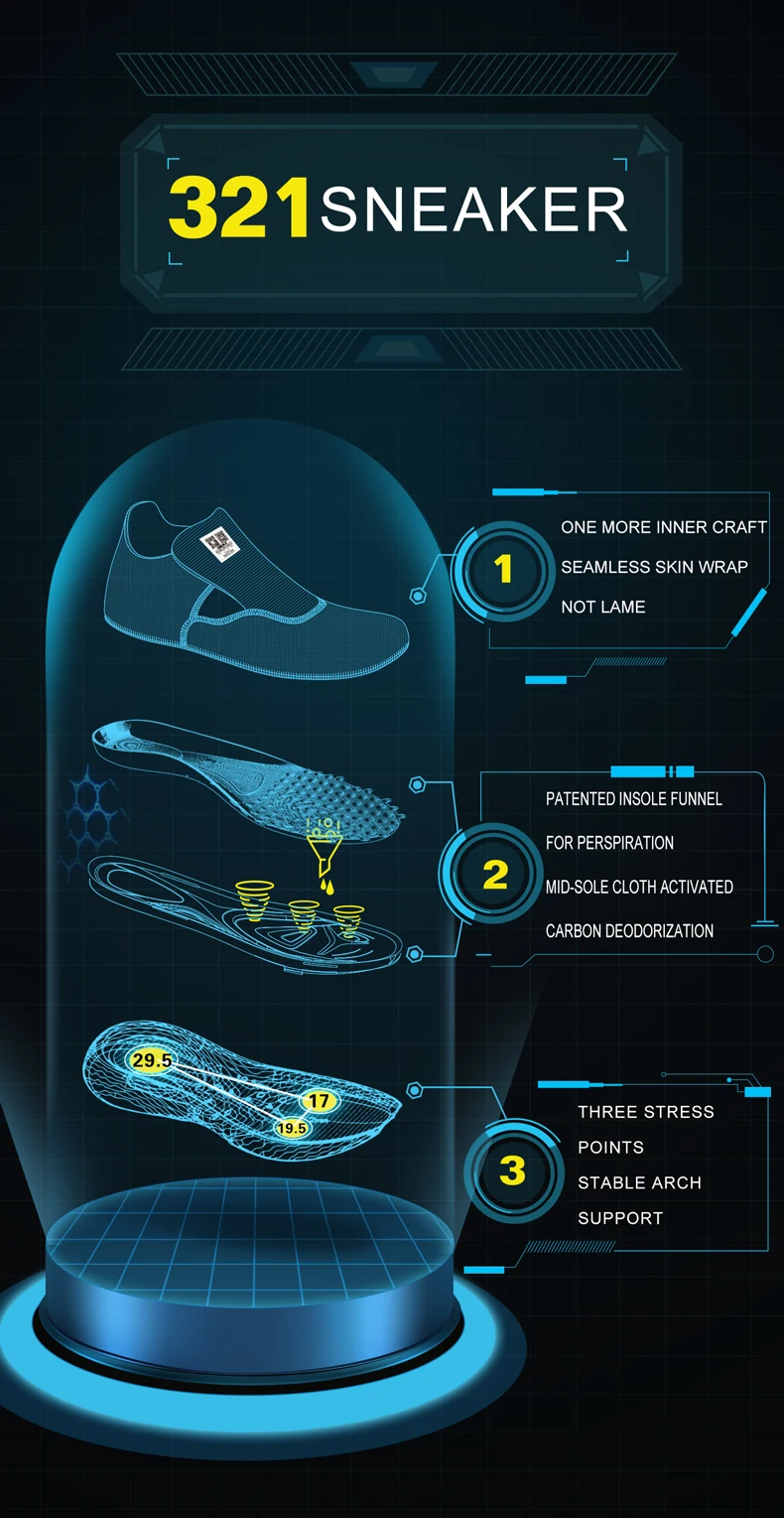 1. Еще одна внутренняя отделка бесшовной кожи не хромает 2. Запатентованная Воронка стельки для пота ткань со средней подошвой дезодорирующая с активированным углем 3. Три точки напряжения стабильная поддержка свода