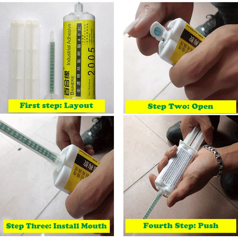 Шаг 1: подготовьте хороший инструмент Шаг 2: Перетащите крышку на 90 ° Шаг 3: Установите клей на смешанный рот Шаг 4: нажмите на клей с помощью клюшки Шаг 5: Используйте сопло для смешивания, чтобы выровнять положение, которое должно быть скреплено Небольшое количество клея, можно использовать для выдавливания непосредственно