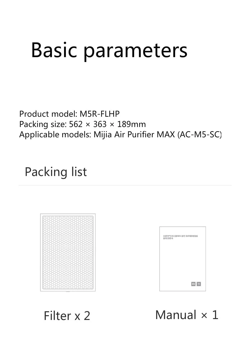 Модель изделия: M5R-FLHP Размер упаковки: 562 × 363 × 189 мм Применимые модели: Mijia очиститель воздуха MAX (AC-M5-SC)