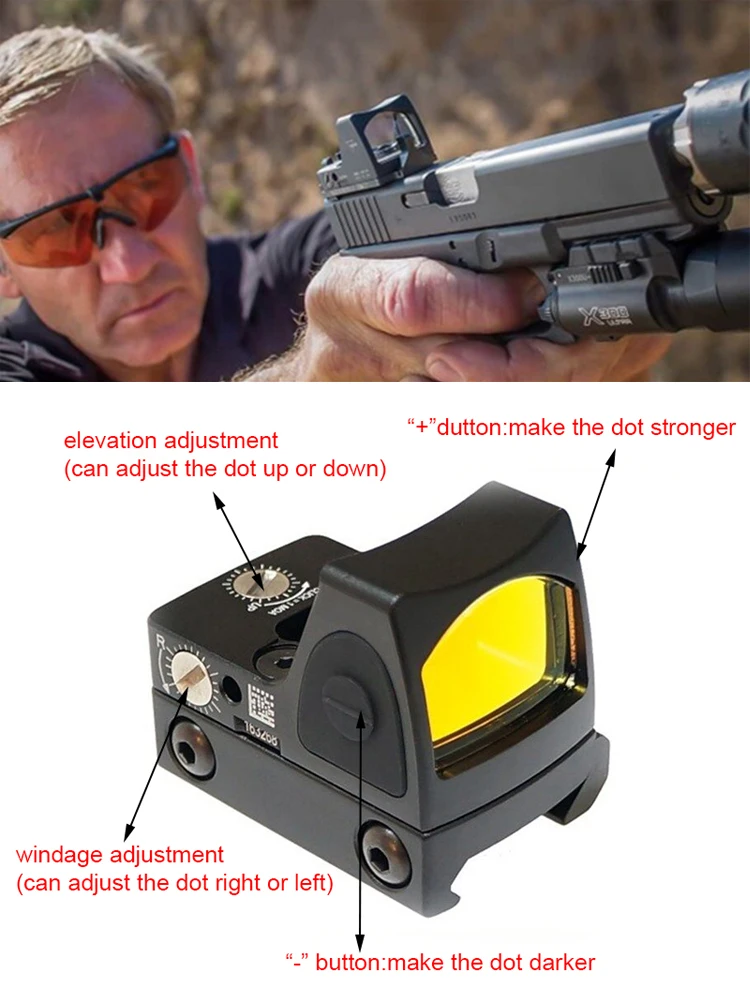 Область Видимости reddot может регулировать высоту и регулировать ветровое стекло. Яркость красной точки может быть изменена сильнее или темнее.