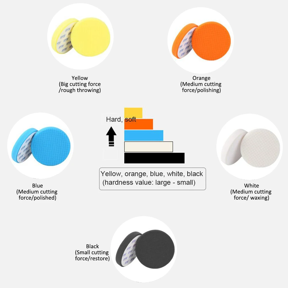 *4.There are five different colors of the sponge pad with different hardness: Yellow> Orange> Blue> White> Black, efficient cutting and polishing the most difficult car oxidation coating, scratches.