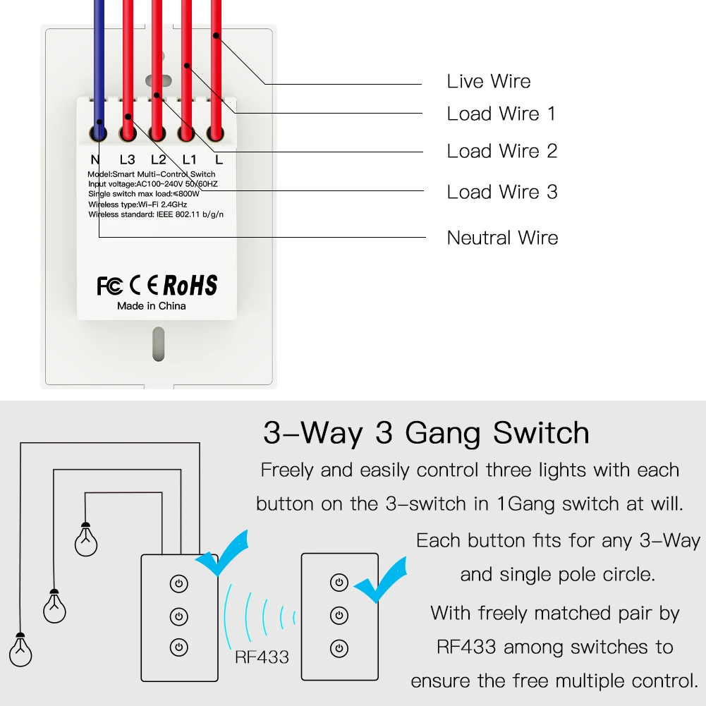 5. Внимание:Этот умный переключатель требует нейтрального провода в ваших коробках переключателей для правильной работы. Кроме того, устройство поддерживает только сеть 2,4G. Пожалуйста, не'Подключение к сети 5G или гибридной сети. Кроме того, мы предлагаем вам приобрести такого рода умный переключатель дистанционного Управление и заменить традиционные 3-сторонний выход переключатель вести свою умную жизнь с большим комфортом и удовольствием.Рассмотреть Разнообразие применений домашней проводки,Вы только в том случае,Нужен один смарт-переключатель для работыС легкостью, чтобы избежать этого.
