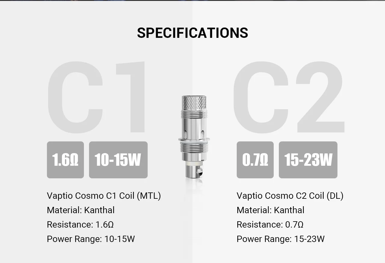 • Cosmo C1 катушка: 1,60 Ом, для вейпа в MTL, для использования от 10 до 15 Вт • Cosmo C2 катушка: 0,70 Ом, для вейпа в DL, для использования от 15 до 23 Вт