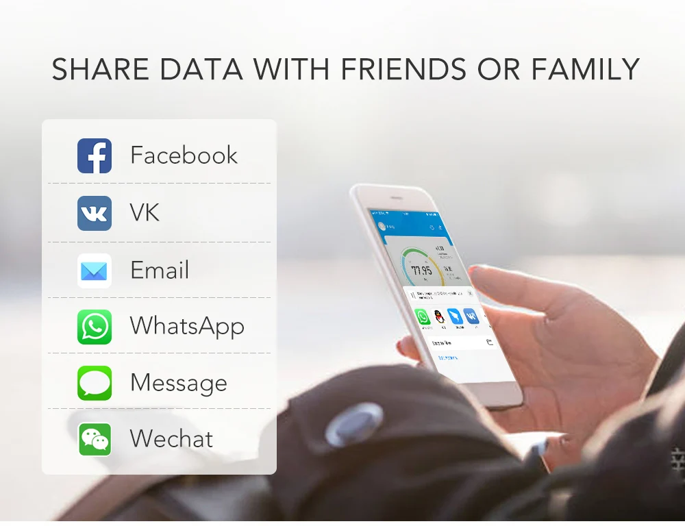 В SINOCARE Bluetooth измерительных оснащена четырьмя высокоточные датчики и четыре электродов, чтобы обеспечить быструю и точный анализ состава тела. Поверхность выполнена из 5 мм закаленное стекло; Низ-изготовлен из высококачественного АБС пластика. Синхронизируется с ваши любимые приложения для фитнеса, приложением OKOK синхронизирует данные с Apple Health и Fitbit приложение!