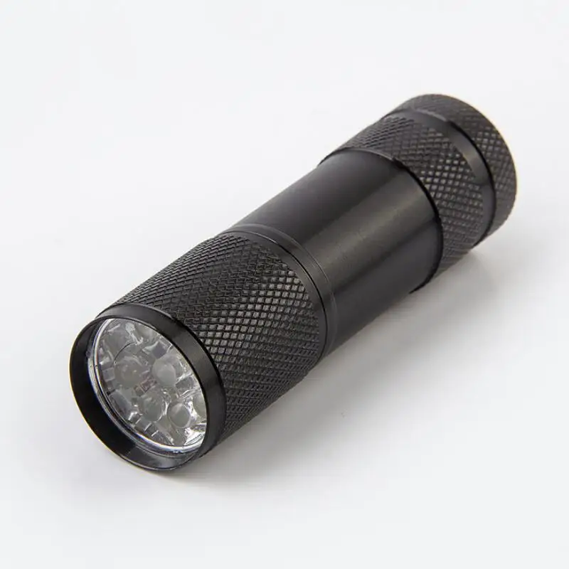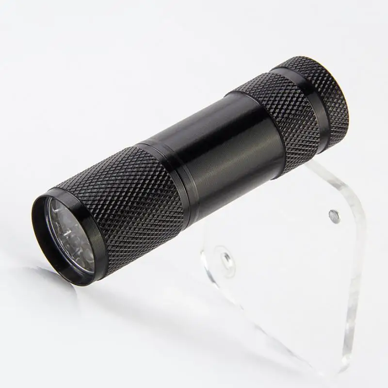 Упаковка товара: 52*31*32 см, Вес: 21 кг, 500 шт. или 400 чехол s, шкаф: 42*31*32 см, чехол: 17 кг Размер продукта: длина трубки 87 мм, диаметр головки 26 мм, диаметр хвоста 26 мм; Вес продукта: 40 г посылка: белая коробка Цвет: (черный, красный, серебристо-серый, синий) на выбор Источник светильник: 9 УФ-фиолетовых волн: 365-400 нм Источник питания: три батарейки AAA используются для освещения: 6-8 часов (без батареек продаются) Рабочее напряжение: 4,5 в режим переключения: задний кнопочный переключатель Модель продукта: d9c-6uv Материал: алюминий 6063-T6 Обработка поверхности: окисление