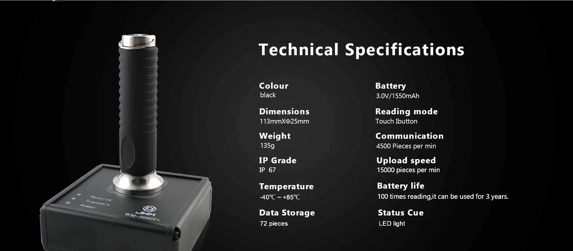 Storage capacity: 7200 records Battery: CR123A-3.0V Disposable Lithium Battery Battery Capacity: 800 days using with 100 buttons read each day. Communications: High download speed by USB cable to computer. Prompt: LED prompt.