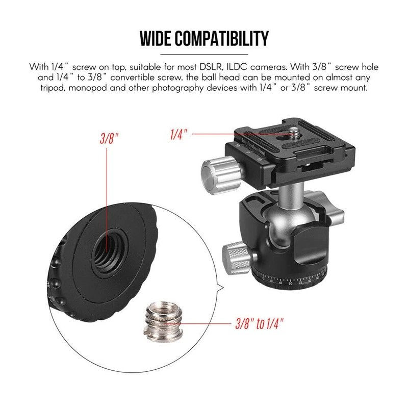 Широкая совместимость: Максимальная грузоподъемность до 10 кг/22 фунта. С винтом 1/4 дюйма сверху, подходит для большинства камер DSLR, ILDC. С резьбовым отверстием 3/8 дюйма и конвертируемым винтом 1/4-3/8 дюйма шаровая Головка может быть установлена практически на любом штативе, моноподе и других фотографических устройствах с винтовым креплением 1/4 дюйма или 3/8 дюйма.