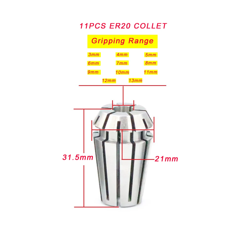 Модель: ER20 Точность: <0,015 Материал: 65Mn 6 шт. диапазон захвата: 3 мм, 4 мм, 6 мм, 8 мм, 10 мм, 13 мм 11 шт. диапазон захвата: 3 мм, 4 мм, 5 мм, 6 мм, 7 мм, 8 мм, 9 мм, 10 мм, 11 мм, 12 мм, 13 мм Подходит для: сверления, фрезерования, сверления, резьбы, гравировки, ЧПУ, шпиндельных станков и другой обработки Примечание: Измерения выполнены вручную, допускается погрешность в 1-2 мм, спасибо.