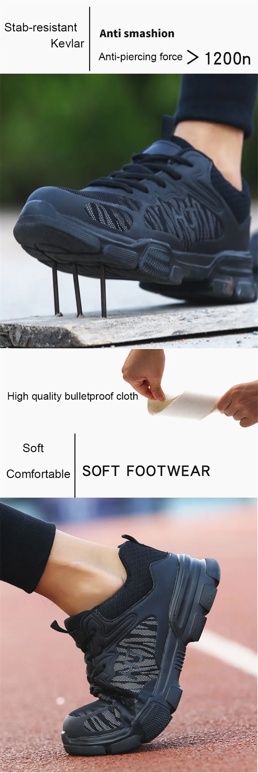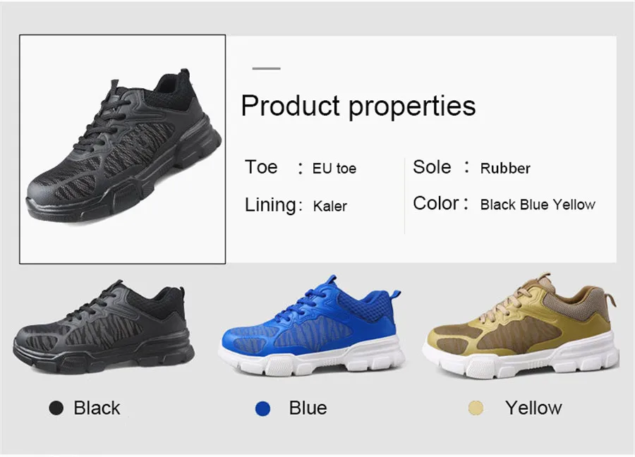 Удобная и дышащая Рабочая безопасная обувь; новейший комфортный дизайн; рабочие ботинки! Особенности: 1: удобный (Научный дизайн, подходит для долгих часов работы) 2: дышащий (Летающий воздушный сетчатый верхний материал) 3: Легкий (Сверхлегкий материал обеспечивает превосходный комфорт) 4: защитный (Европейская сверхпрочная сталь защищает ваши пальцы) 5: защита от проколов (Промежуточная подошва из кевлара обеспечивает безопасность ног) 6: Нескользящие (Уникальный дизайн текстуры) 7: изоляция 8: Мода