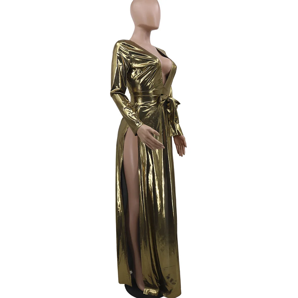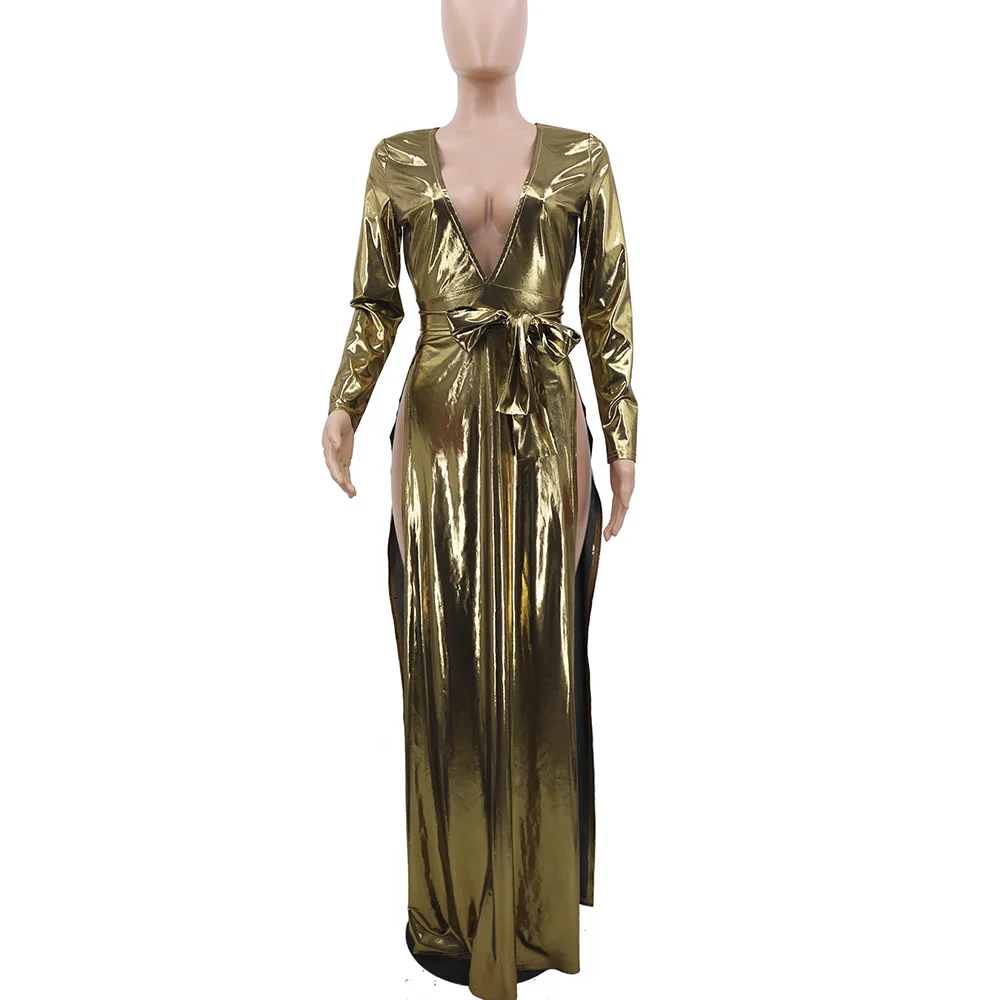 Вечерние Платье длинное сексуальное нижнее белье с глубоким v-образным вырезом с длинным рукавом длиной до пола-Длина элегантные пикантные однотонные пуловер трапециевидной формы Разделение Макси платья для Для женщин