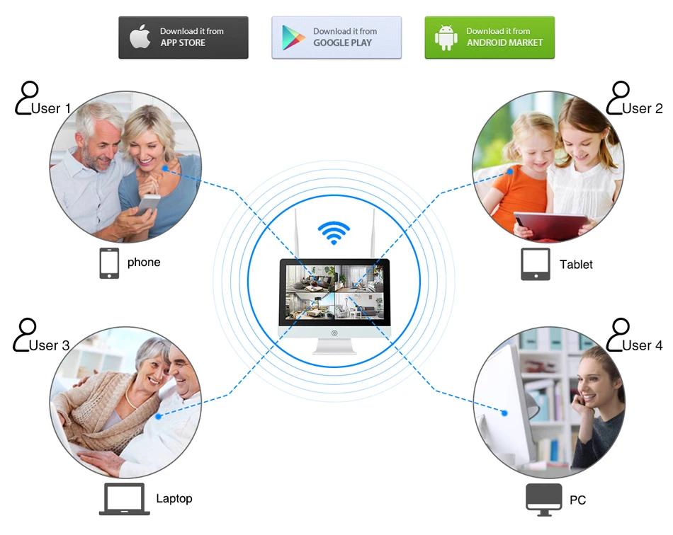 На основе технологии P2P (peer to peer), поддержка установки plug-and-play. Доступ к ip-камере через веб-интерфейс через Интернет-проводник, также поставляется с бесплатным приложением для смартфонов (Android и iPhone) для удаленного просмотра из любого места.