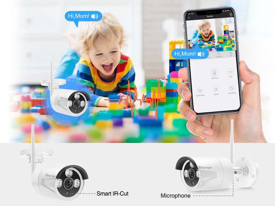 1, 8-канальный NVR дизайн, поддержка подключения до 8 шт камер, вы можете купить Techage Беспроводные ip камеры для расширения вашей системы видеонаблюдения 2, все камеры встроены в микрофон, поддержка звукозаписи
