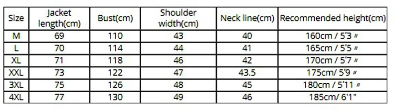 Таблица размеров: